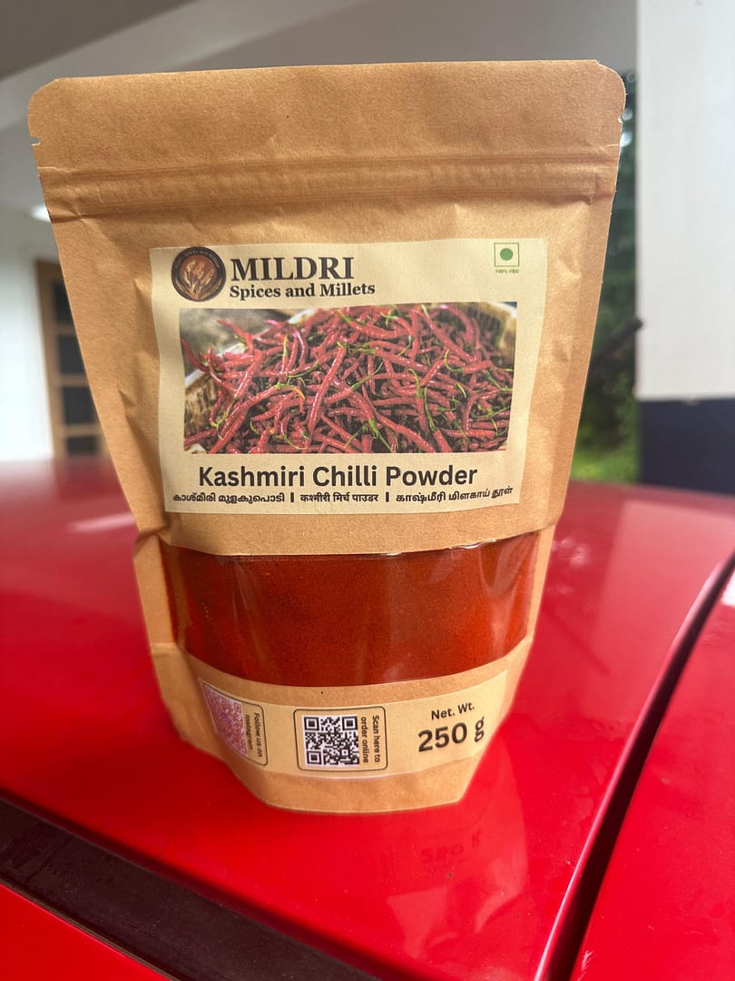 Kashmiri Chilli Powder available in 100g and 250g resealable pouches to ensure freshness and convenience exclusively at Mildri. This product is freshly prepared in Pathanamthitta and available for courier delivery all over Kerala and India.
