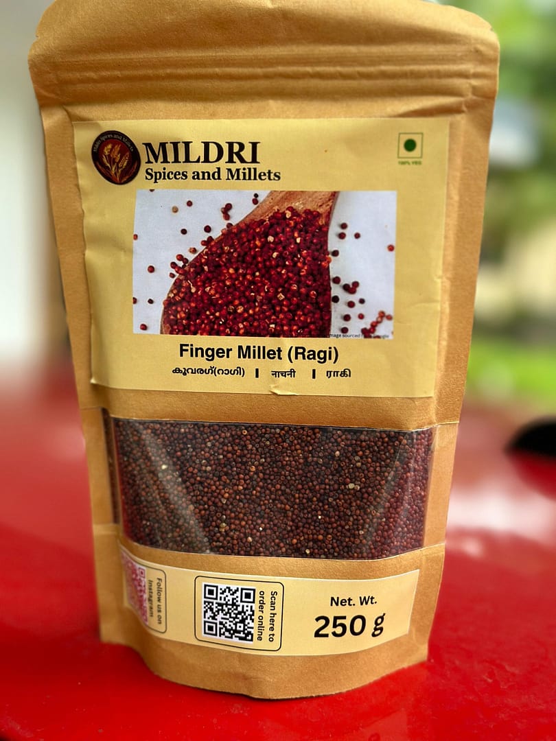 Finger millet available in 250g and 500g resealable pouches to ensure freshness and convenience exclusively at Mildri. This product is freshly prepared in Pathanamthitta and available for courier delivery all over Kerala and India.