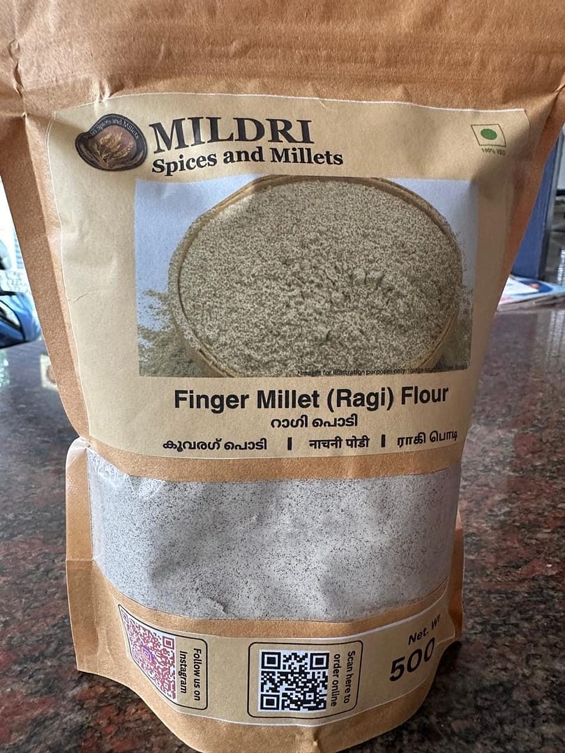 Finger millet flour available in 500g resealable pouches to ensure freshness and convenience exclusively at Mildri. This product is freshly prepared in Pathanamthitta and available for courier delivery all over Kerala and India.